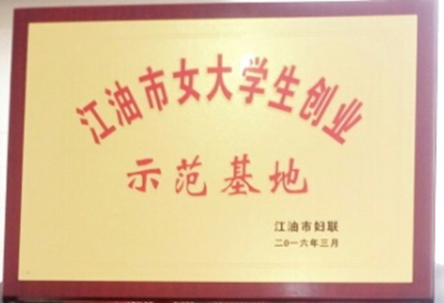 圖為韓銀華主席授“江油市女大學(xué)生創(chuàng)業(yè)示范基地”牌